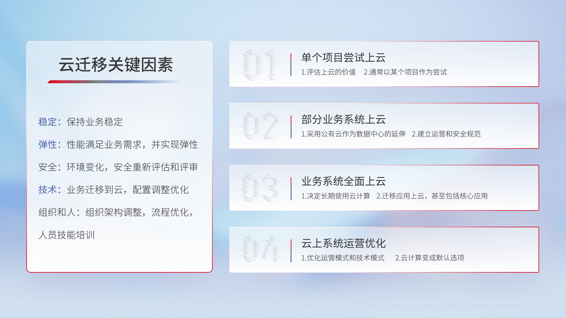 结合实际业务,,,,从规划设计、、云平台选型、、云原生改造、、、数据迁移、、集成交付,,,,迁移全过程为客户识别最佳上云路径,,,做好风险识别管理,,,设计网络架构、、、、身份权限、、、安全审计合规、、、操作审计、、日志审计、、、、监控告警策略、、、、多站点容灾设计等,,,,对云上基础设施进行整体规划,,,,提升IT治理水平,,以满足弹性、、、高可用、、、高性能的需求。。