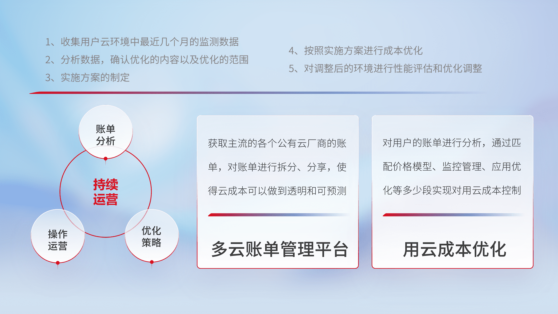 通过多云纳管,,以统一的资源数据模型把客户的云资源进行抽象和封装,,进而实现对多云资源的统一操作,,保障云资源管理的可靠性、、、、稳定性与可用性。。。量身定制化运维内容,,,配置、、开发运维、、、、补丁管理、、、、备份、、、监控、、认证和访问管理、、、、审计和日常巡检等,,,保障在用云过程中的可靠度,,稳定度以及高可用率。。。。